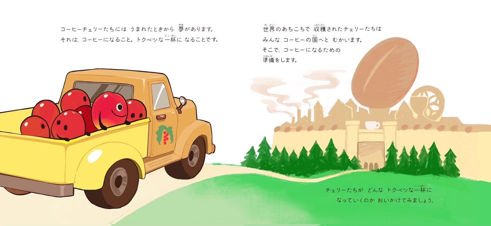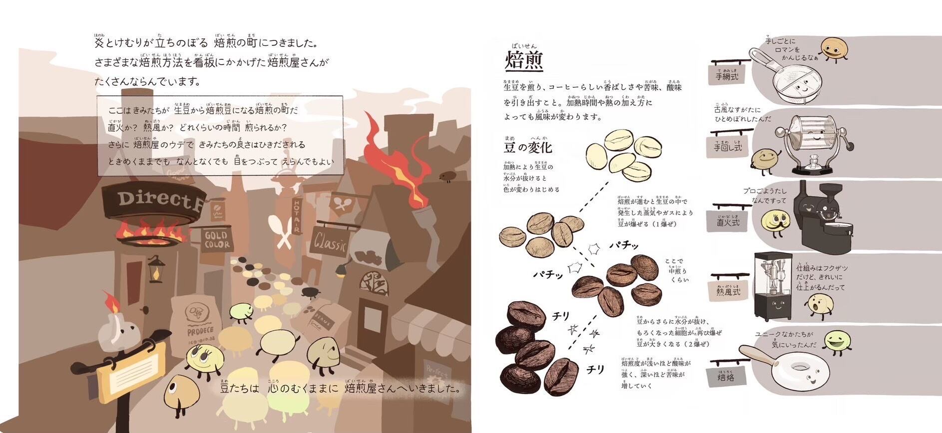 意外と知られていない「コーヒーチェリーから一杯のコーヒーになるまで」をイラストで楽しく学べる図鑑形式の絵本。専門用語も出てきますが、”読みやすさ”がこの絵本の推しポイント!全ての漢字にふりがなが振られており、大人から子供まで楽しめる絵本になっています。知って嬉しい、眺めて楽しい一冊です。
